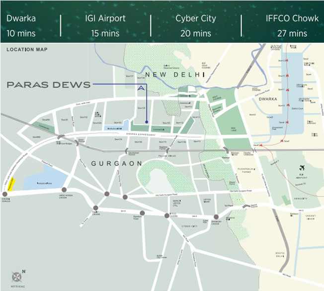 Paras Dews is strategically located in a prime location in sector 106, Dwarka Expressway.Dwarka Expressway is the new growth centre in Delhi and Gurugram, located in proximity to IGI Airport, upcoming DiplomaticEnclave 2 and Dwarka(largest sub-city in Asia). This 150mtr wide expressway runs parallel to National Highway 8 and providesseamless connectivity between Dwarka and Gurugram. Paras Dews's central location on this expressway ensures that you stayconnected to everything and meet your urban lifestyle demands, making these residences the most coveted address in Gurugram.